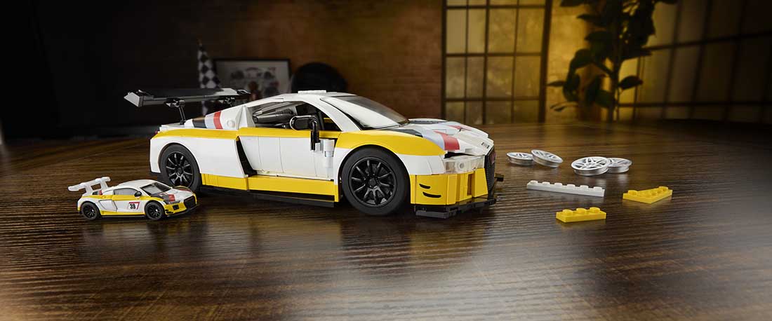 El modelo para Mattel Brick Shop corresponde a la segunda generación del auto. El set en escala 1:16 cuenta con techo removible para acceder al interior detallado, puertas abatibles y cofre de motor funcional. Además, incluye un volante conectado directamente a las llantas que permite movimiento realista. Los fanáticos pueden personalizar su Audi con calcomanías intercambiables, difusores, alerones y un juego adicional de rines metálicos. Este set también incluye una placa metálica exclusiva de Hot Wheels.